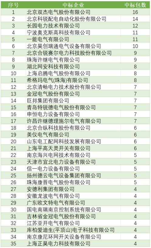 企業(yè)中標(biāo)包數(shù)方面,共有15家企業(yè)中標(biāo)2個或以上包數(shù),占中標(biāo)企業(yè)總數(shù)的52%。北京科銳配電自動化股份有限公司中標(biāo)包數(shù)最多,共6個包。