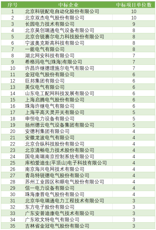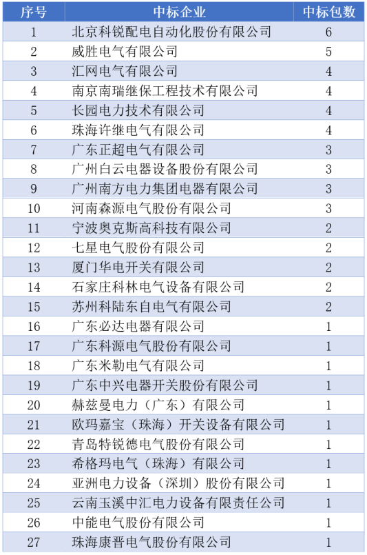 總體中標(biāo)數(shù)量方面,北京科銳配電自動化股份有限公司中標(biāo)金額到達(dá)約2億元;還有4家企業(yè)超越約1億元。