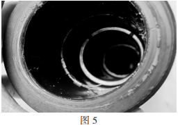 事故分支箱電纜終端所使用的硅脂密封功能不良,故障發生后,當拆撥其它兩相電纜頭時,由于硅脂出現干枯粘結(如圖5),需要多人合力才干撥出,可見硅脂已不能起到潤滑防潮與絕緣的作用,不能與電纜頭同“呼吸”,彈性功能大為下降。