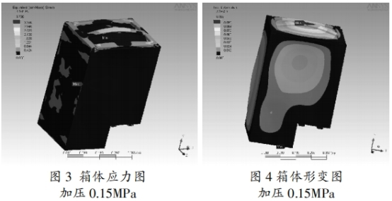 箱壁厚度滿足資料的許應應力請求及氣箱允許變形量請求。經(jīng)過軟件剖析核算后得到氣箱的應力散布(見圖3)及箱體形變(見圖4),終究找到氣箱壁厚。